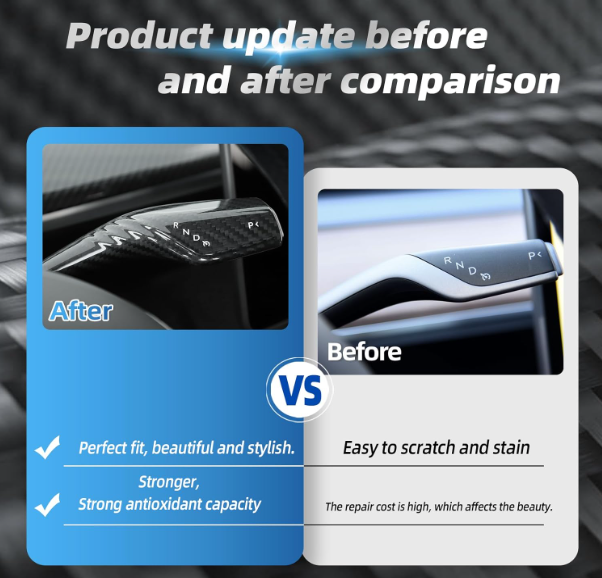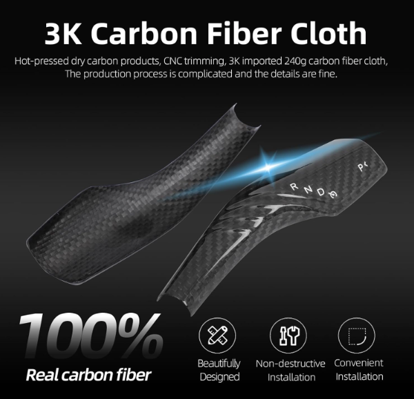 【3K碳纖維換檔蓋】特斯拉Model 3/Y 換檔蓋採用真正的碳纖維製成,與傳統的abs材料完全不同,不會產生氣泡,碳布圖案不會變形和扭曲,更有效防劃傷,使用壽命長,低調奢華。 【完美匹配】特斯拉Model 3/Y轉向柱蓋根據特斯拉Model 3&Model Y的原始資料進行1:1模具鑄造而成,高標準走線,弧度一致,精心打磨,避免刮花漆面影響原廠車輛功能、完善您的 Tesla 的優質配件。 【非破壞性安裝】安裝這款特斯拉型號 3/Y 碳纖維柱換檔撥片變速桿時,無需拆卸和損壞任何原車零件,只需用粘合佈和膠帶將其覆蓋即可你的原廠車轉向換檔撥片,整個安裝過程只需幾分鐘即可完成,非常簡單方便。 【Tesla 轉向換檔撥片】Tesla model 3/Y 轉向桿蓋適用於 "2020-2022 ModelY ,2017-2022 Model3" ,您可以選擇光面和啞光款式,專門針對 Tesla Model 3 和 Model Y 設計。