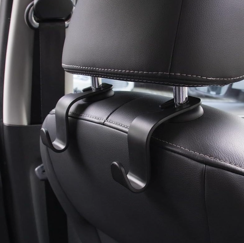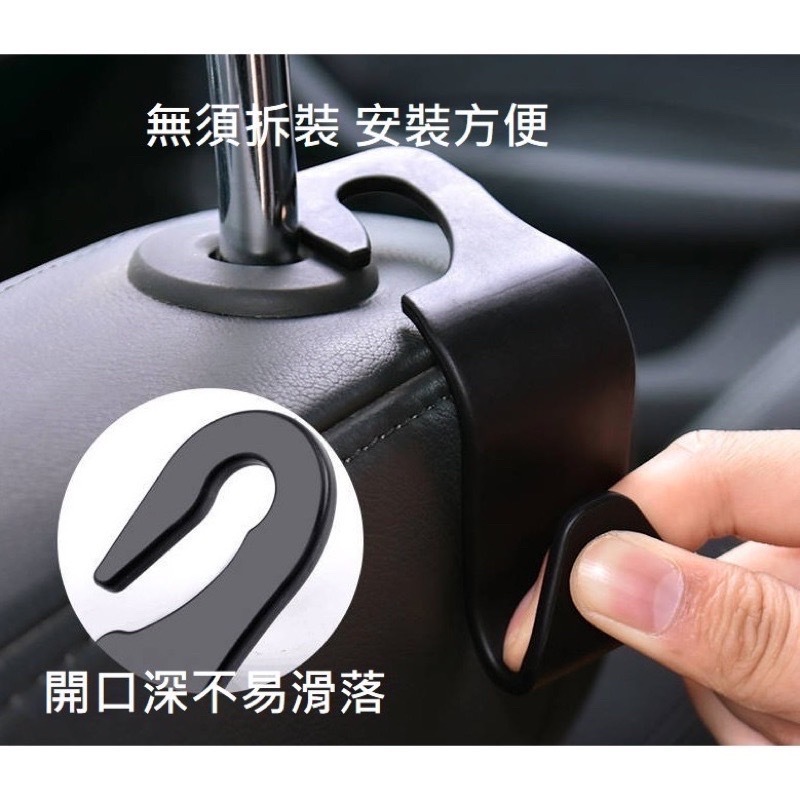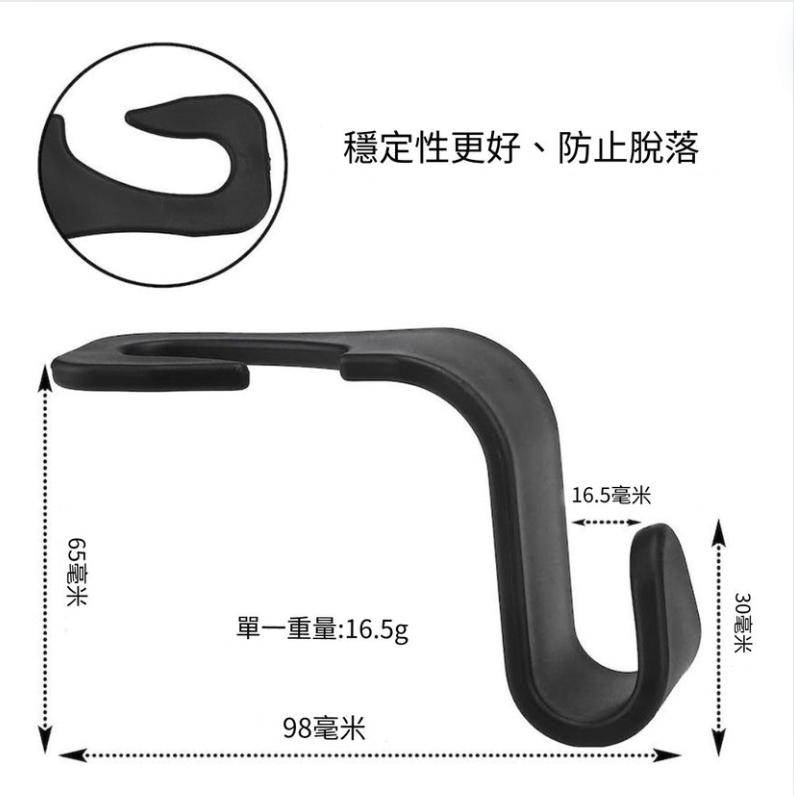 座椅背掛鉤 穩定性更好、防止脫落 顏色:黑色 材質:塑膠 規格:一套2件 安裝位置:前座椅背 安裝方法:確保乾淨表面,扣上椅背後方,無損安裝